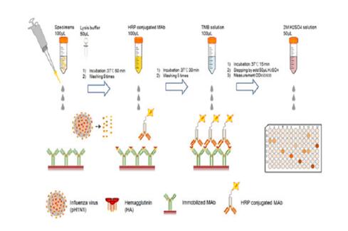 ELISA方法的基本原理是将酶标记到抗体(抗原)上,使待检测物中相应的抗原(抗体)与酶标记抗体(抗原)发生特异性反应。此种酶标记抗体可与吸附在固相载体上的抗原或抗体发生特异性结合。在遇到相应的酶底物时,酶能高效、专一催化、分解底物,生成有颜色的产物。因此,可通过底物的颜色反应来判定有无相应的免疫反应,颜色反应的深浅与标本中相应抗体或抗原的量呈正比。此种显色反应可通过ELISA检测仪进行定量测定,这样就将酶化学反应的敏感性和抗原抗体反应的特异性结合起来,使ELISA方法成为一种既特异又敏感的检测方法。