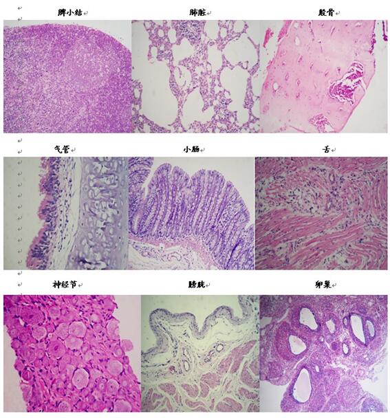 HE染色是组织学、胚胎学、病理学教学与科研中最基本、使用最广泛的技术方法。 即是苏木精-伊红染色法。苏木精染液为碱性,主要使细胞核内的染色质与胞质内的核糖体着紫蓝色;伊红为酸性染料,主要使细胞质和细胞外基质中的成分着红色。易于被碱性或酸性染料着色的性质分别称为嗜碱性和嗜酸性;若于两种染料的亲和力都不强,则称中性。一般的组织变化和组织产物都可以通过这一染色法显示出来。是形态学最常用的染色方法。直到目前为止,病理组织学的基本知识,绝大多数都是从观察HE染色标本中得来,在质量较佳的HE染色切片上,各种组织或细胞的一般形态结特点都可以观察到。