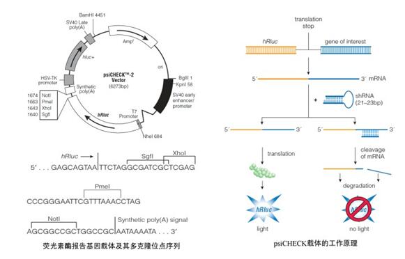 本公司生物运用分子生物学技术将miRNA靶基因3’UTR区域构建到psiCHECK™-2荧光素酶报告载体检测系统,通过与miRNA mimics、inhibit共转或者转染miRNA稳定表达细胞系中,通过多功能酶标仪检测报告基因的表达水平,进行靶点筛选及鉴定。