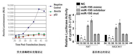 miRNA可同时调控多个靶基因,从而影响细胞的功能。miRNA调控靶基因的验证常是荧光报告素酶活性检测,结合软件预测及蛋白验证,提高靶点预测的精确性及可行性。