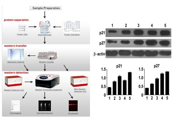 Western Blotting是一种检测组织或细胞内特异蛋白质表达情况的一种分析技术。通过聚丙烯酰胺凝胶电泳把不同分子量的蛋白质分开。再把蛋白质转移到固相载体(例如硝酸纤维膜),最后使用特异性抗体检测目的蛋白。这项技术被广泛用于检测蛋白水平的表达。如:细胞标志性蛋白检测,检测分析信号通路,蛋白半衰期分析等。